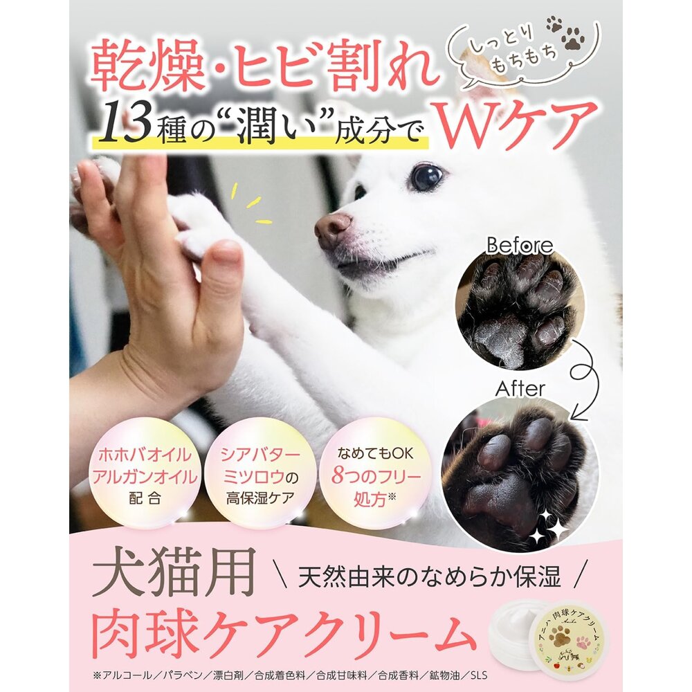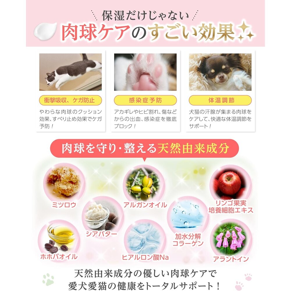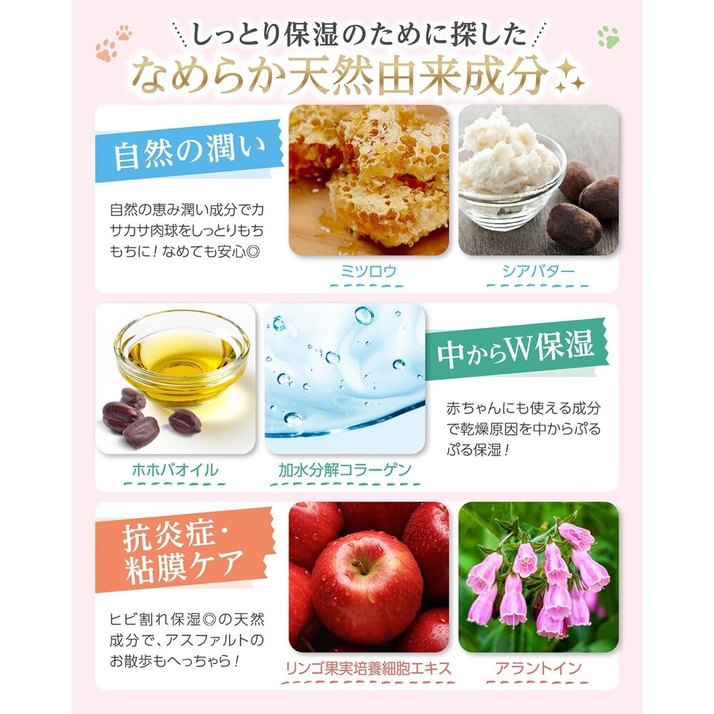 ✅針對乾燥或龜裂的肉球設計,能深入滋潤卻不黏地板,是家中飼養犬貓的理想選擇。