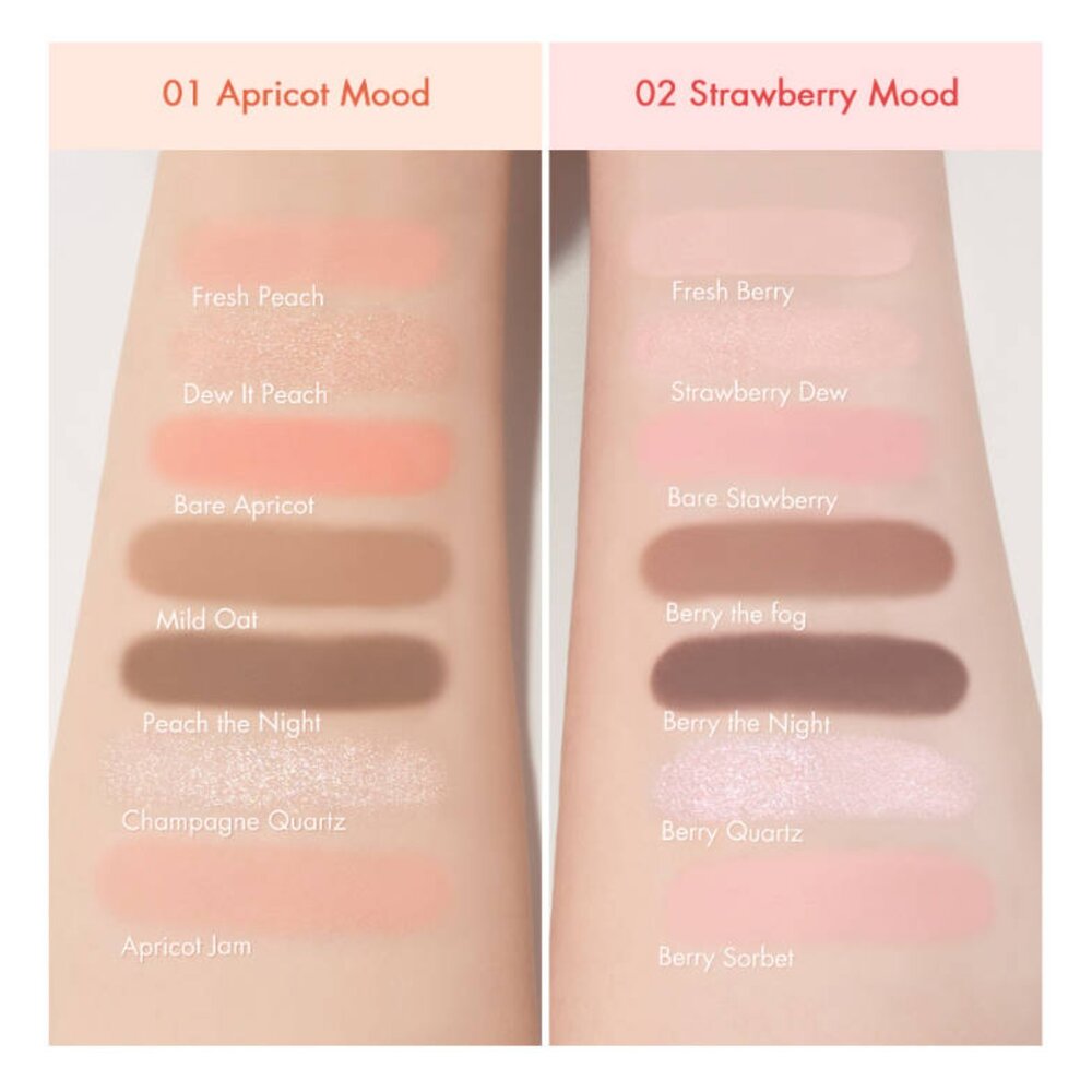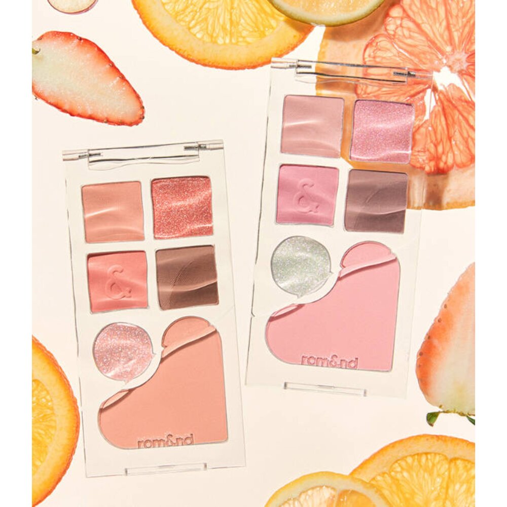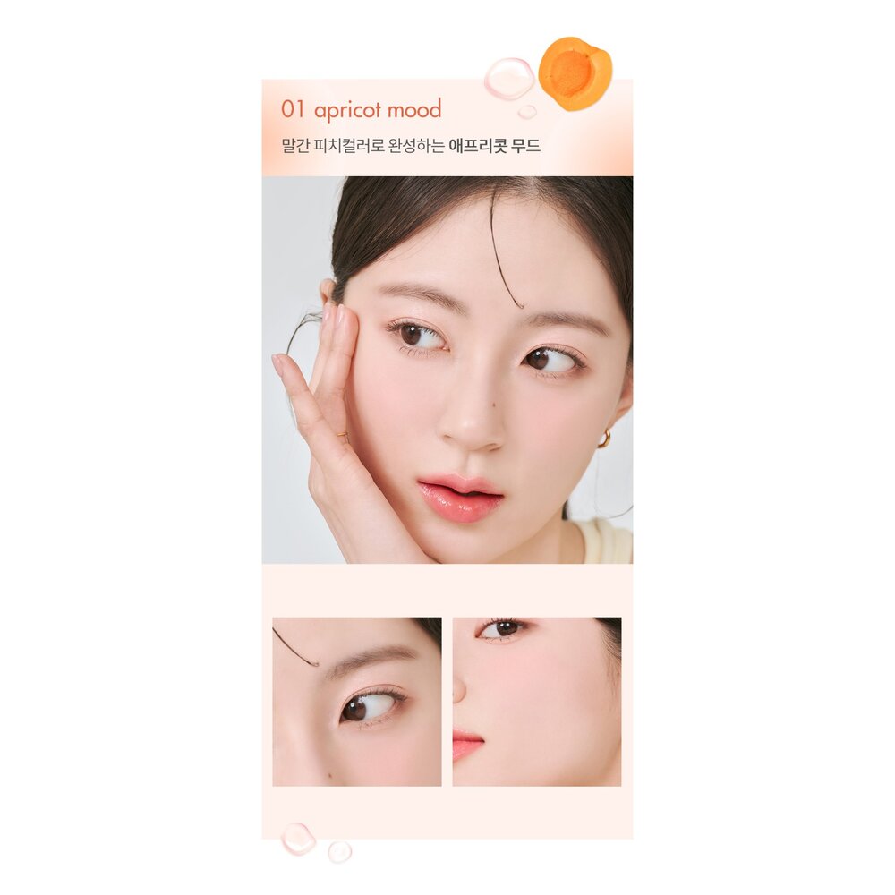 以清透暖色系為主,粉橘、杏桃色疊加,營造柔和日常妝容與立體感