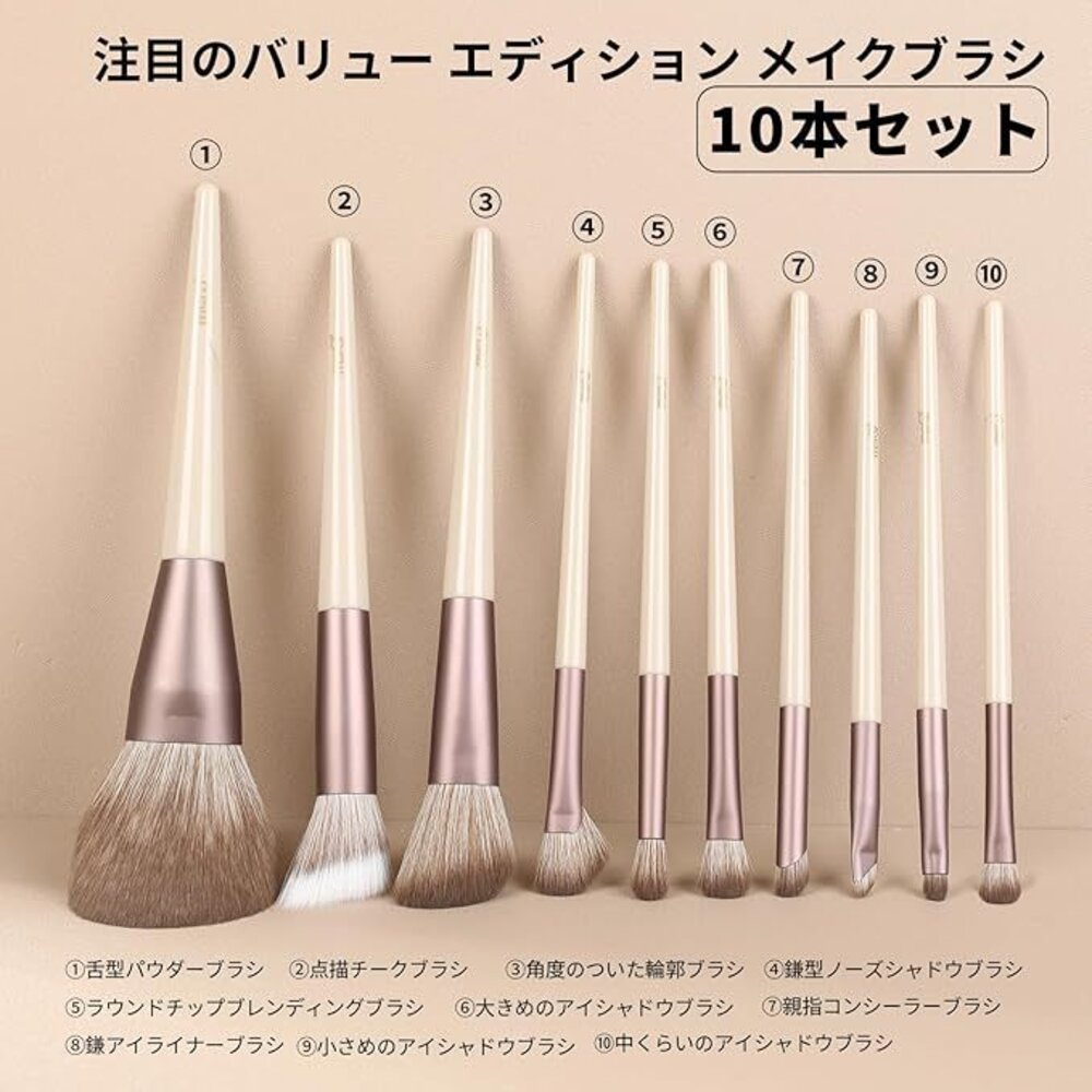 10支刷子套裝:包含圓形拋光刷、斜角拋光刷、錐形拋光刷、扇形拋光刷,以及6個細節刷,能精確進行眼部和唇部化妝。