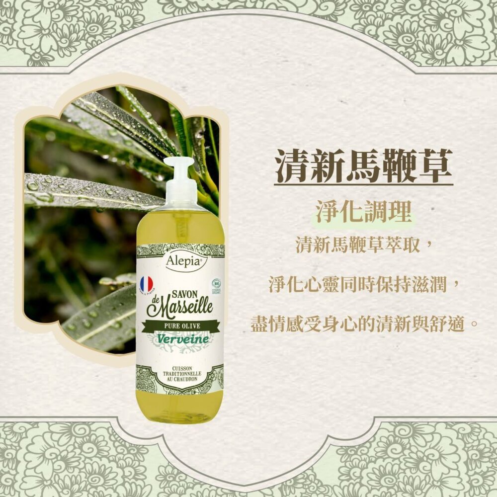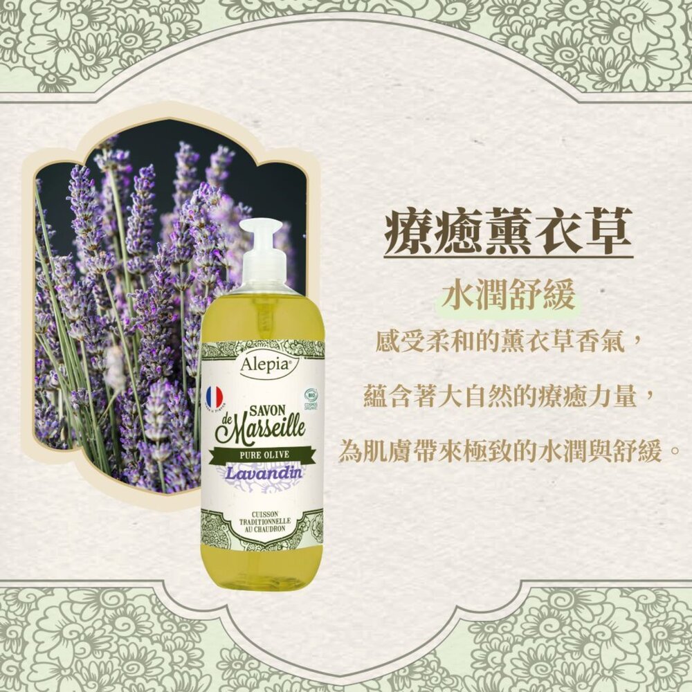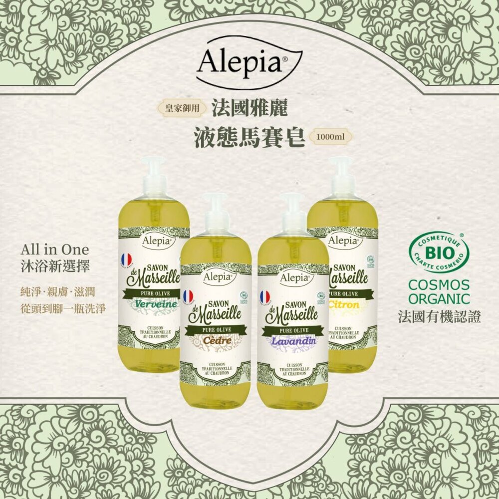 享譽全球的Alepia液態馬賽皂,以有機橄欖油為基底,不含棕櫚油、椰子油,保濕力及親膚性大大提升,讓保濕感更升級,洗完可感受肌膚保有柔滑不乾燥,維持肌膚的水潤光澤!