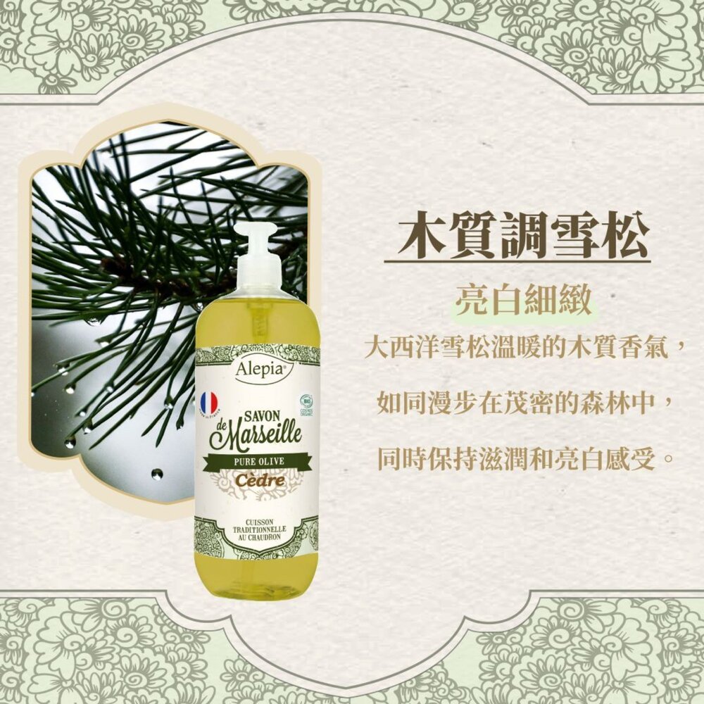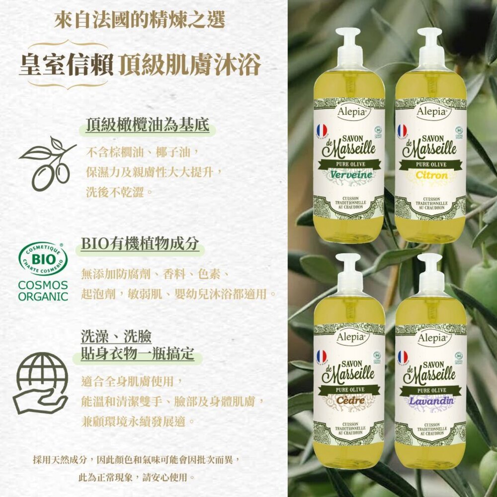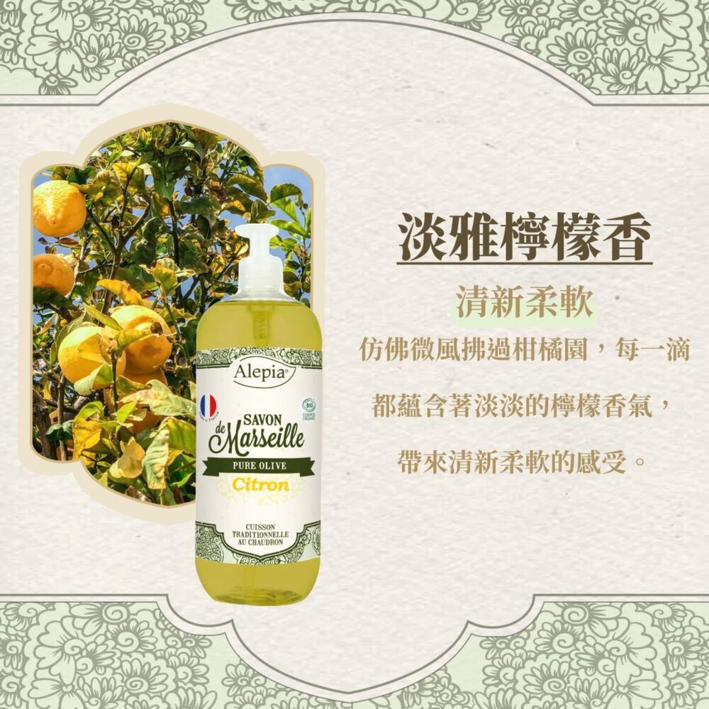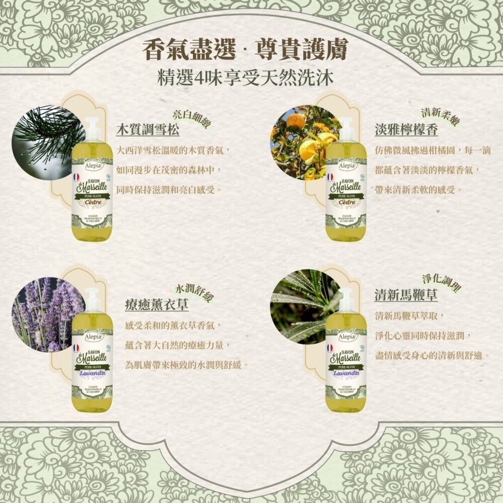 享譽全球的Alepia液態馬賽皂,以有機橄欖油為基底,不含棕櫚油、椰子油,保濕力及親膚性大大提升,讓保濕感更升級,洗完可感受肌膚保有柔滑不乾燥,維持肌膚的水潤光澤!