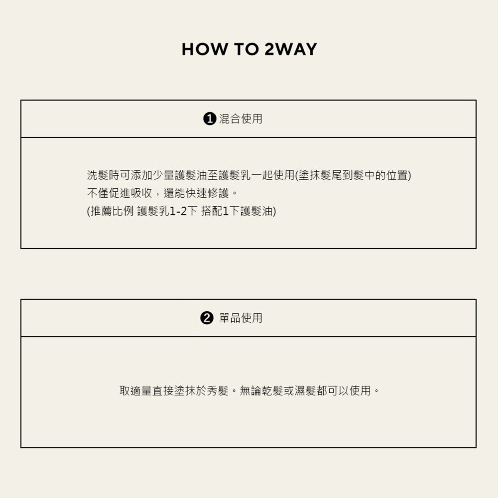 單獨使用:日常也可以使用!塗抹於半乾或是全乾髮尾,撫平毛躁,