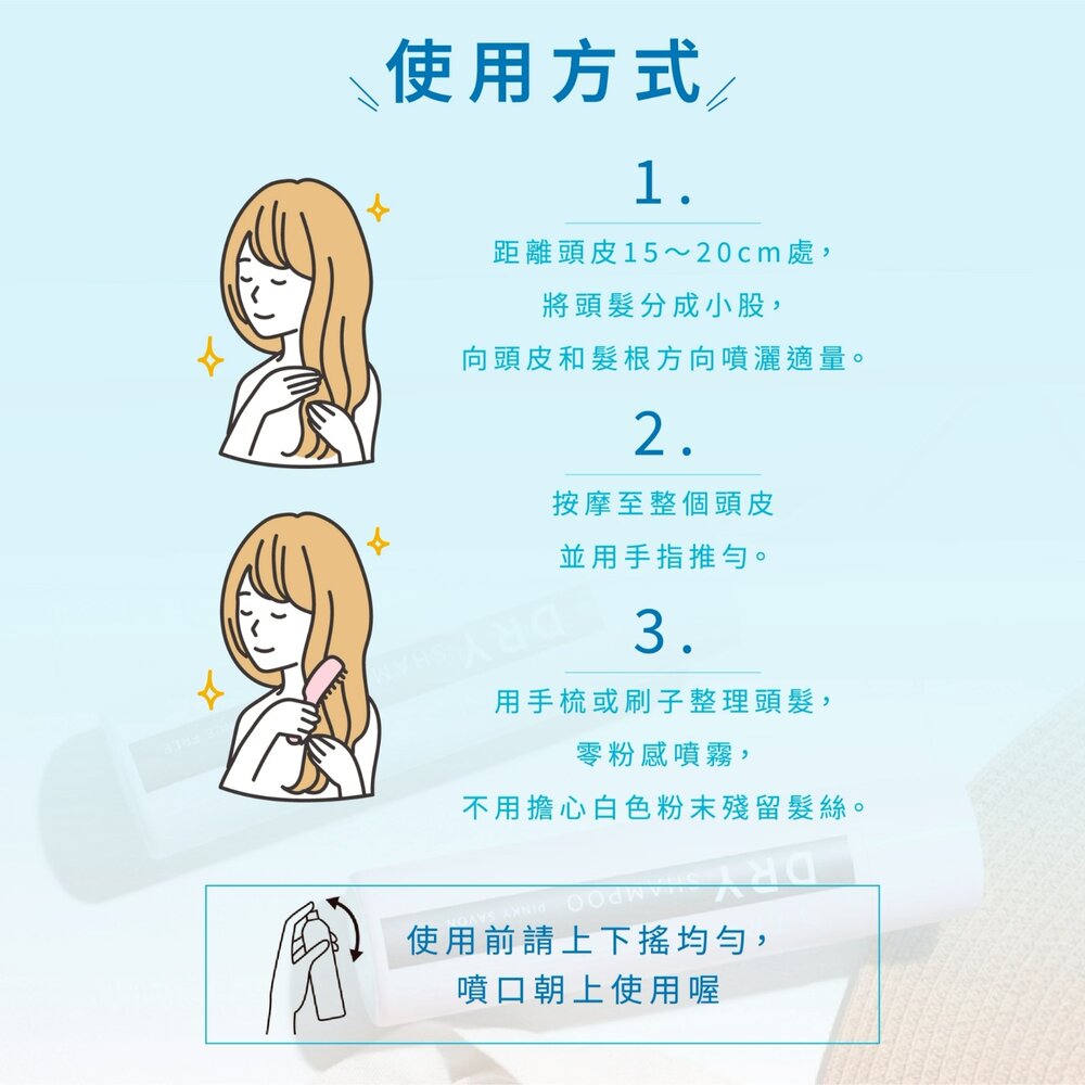 1️⃣距離頭皮15~20cm處,將頭髮分成小股,向頭皮和髮根方向噴灑適量。